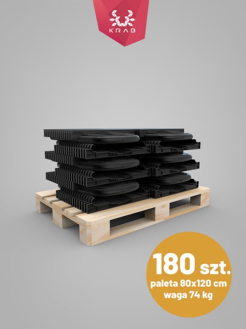 40 sztuk krabów ułożonych i zafoliowanych na palecie 80x120 cm, waga 85 kg, wysokość z paletą 170 cm.